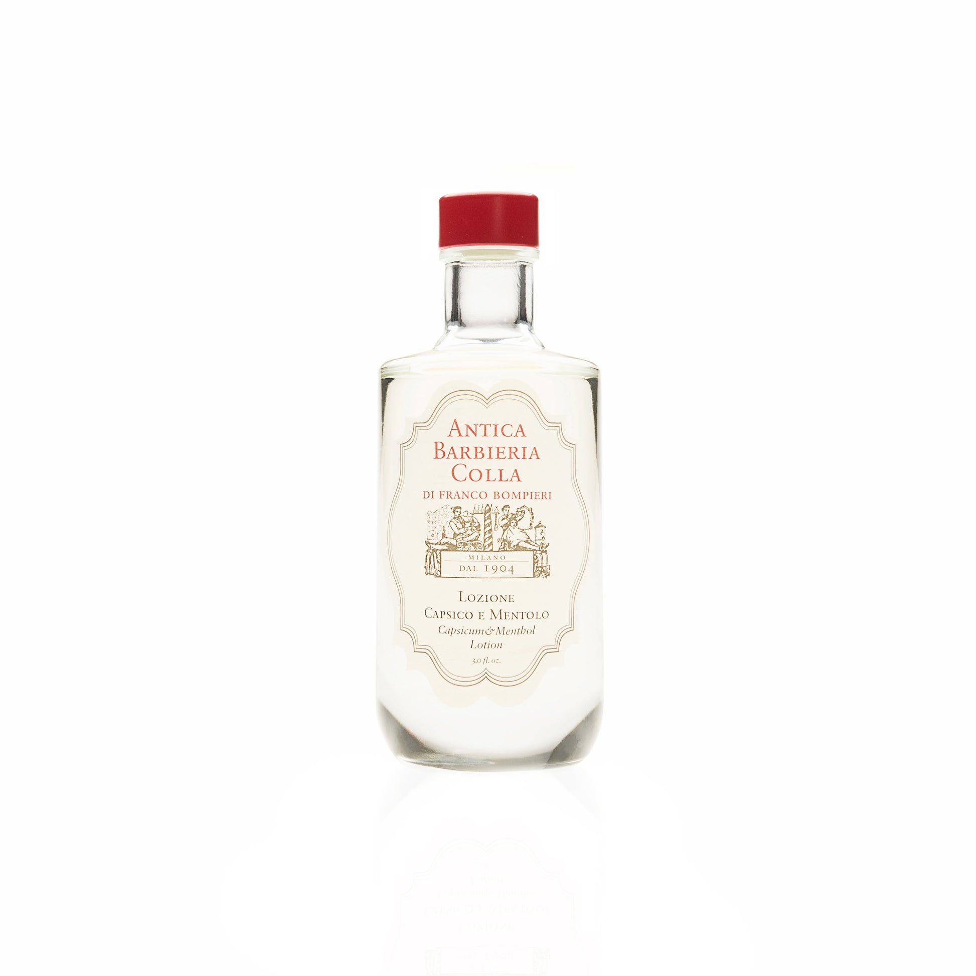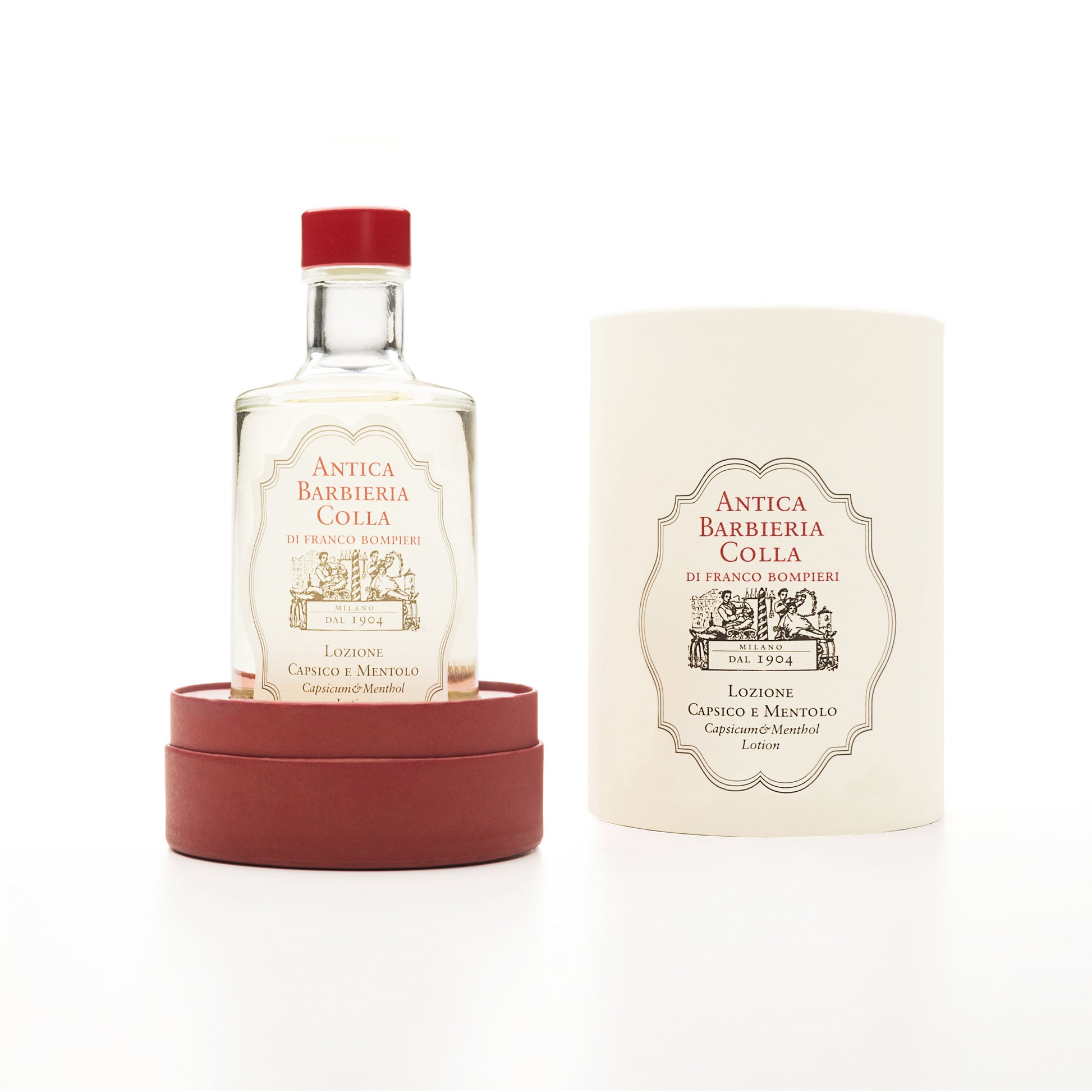 Die Haarlotion Capsico E Mentolo aus dem Hause "Antica Barbieria Colla" ist ein hervorragendes Haar Tonic, dass eine außergewöhnliche Zusammensetzung hat. In der Barbier Tradition wird dieses Produkt am Ende eines jeden Haarschnittes in das noch nasse Haar einmassiert. Dann entfaltet sich der angenehme Duft dieses Tonics, der sehr schwierig zu beschreiben ist. Es handelt sich um eine Mischung aus unterschiedlichen Pfefferminznoten und Menthol, zusammen mit holzig warmen Duftkomponenten. Durch die Ätherischen Öle werden die Kopfhaut und das Haar belebt und gepflegt und die Durchblutung angeregt. Ebenfalls sehr angenehm sind ein paar Tropfen, die im Nackenbereich verrieben werden und den Besitzer mit dem herausragenden Duft umgeben. Die Belebende Wirkung hält durch die einzigartige Zusammensetzung bis zu einer Stunde vor, während einem der Duft den ganzen Tag umgibt.
