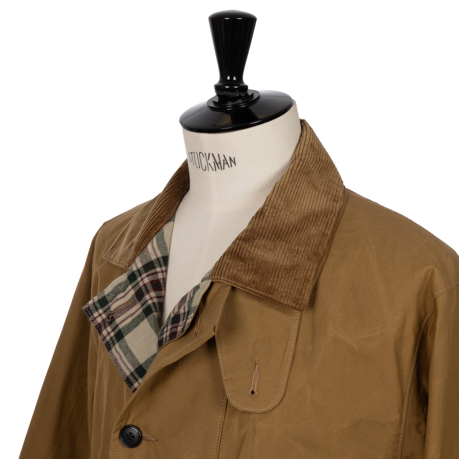Kragen und Ärmelbündchen sind aus Cord in verschiedenen Texturen gefertigt. Der Kragen verfügt über einen Windschott, so daß er schützend aufgestellt werden kann.