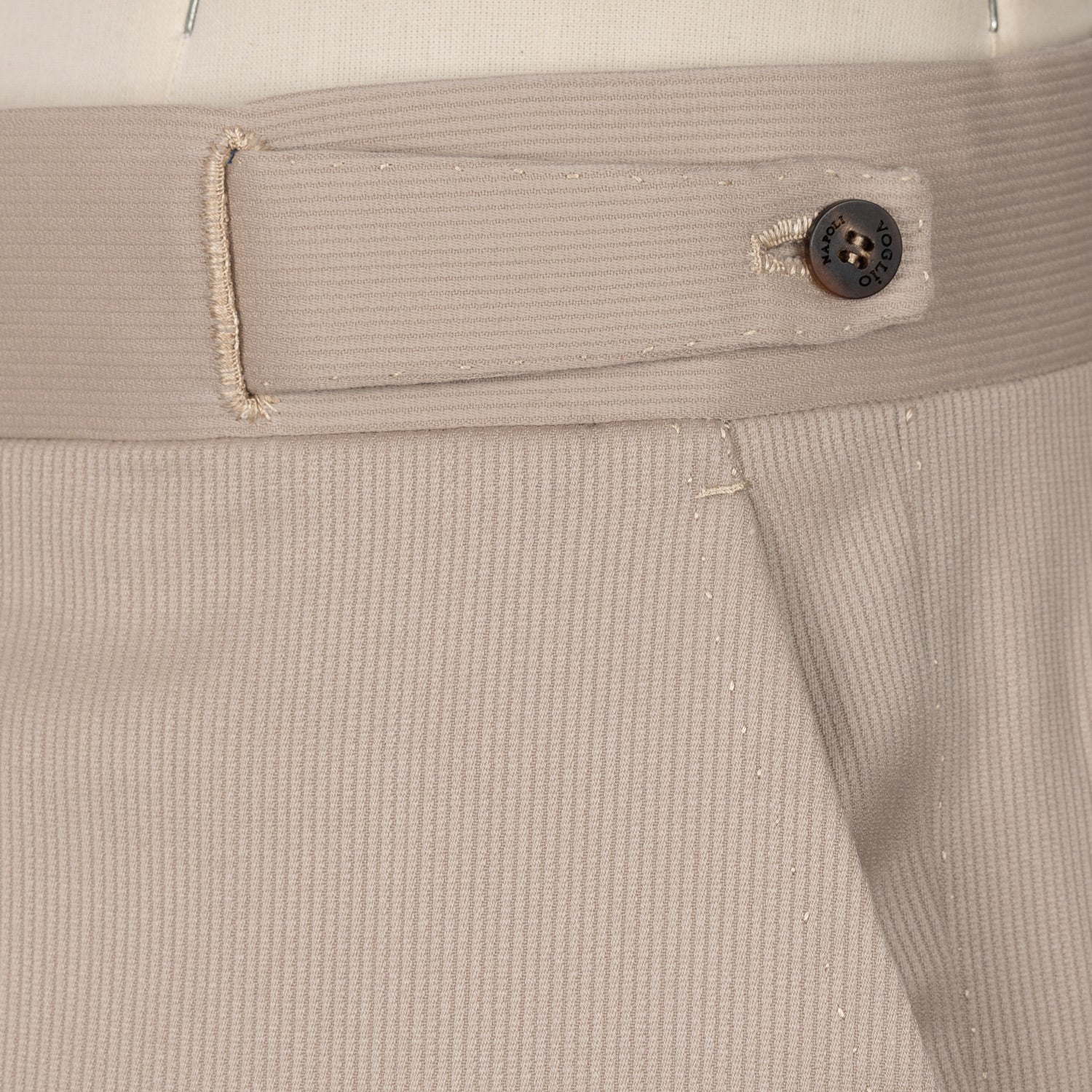 Familie Voglio hat sartoriale Details, wie den "Cinturino Doppio" oder den "Cintura Alto", mit einer höheren Leibhöhe und einem etwas weitere Bein vereint. Eine völlig von Hand gefertigte Hose als Inkarnation der neapolitanischen Hosenschneiderei.