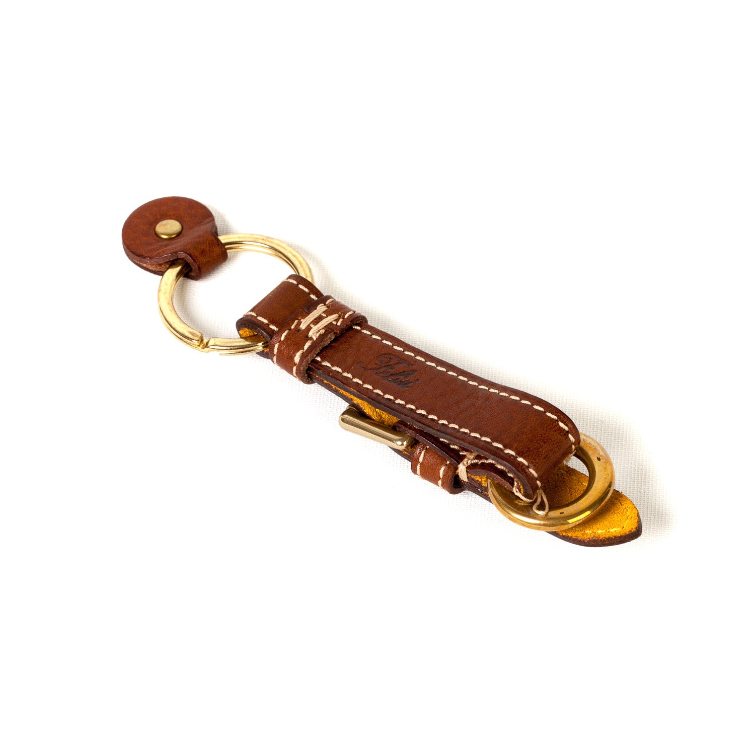 Dieser Schlüsselanhänger besticht durch sein natürlich genarbtes Kalbsleder und die naturweiß gesteppten Nähte. Durch die Messingschließe erinnert dieser Schlüsselanhänger an einen für Felisi typischen Gürtel.