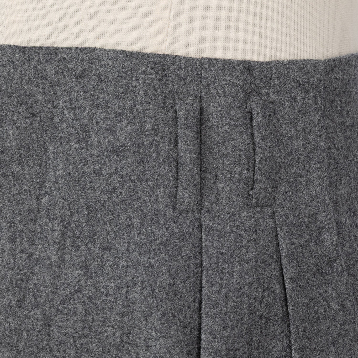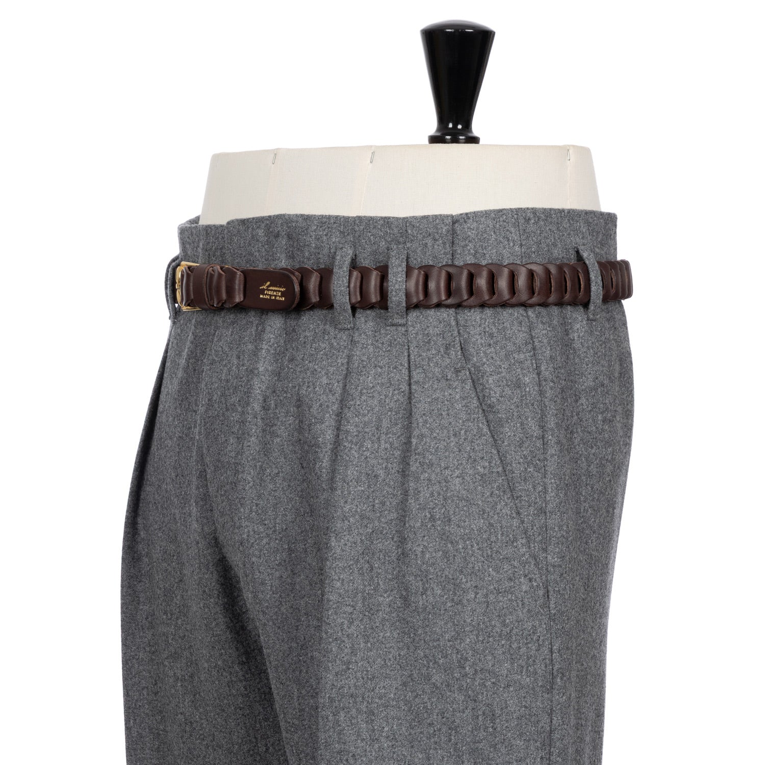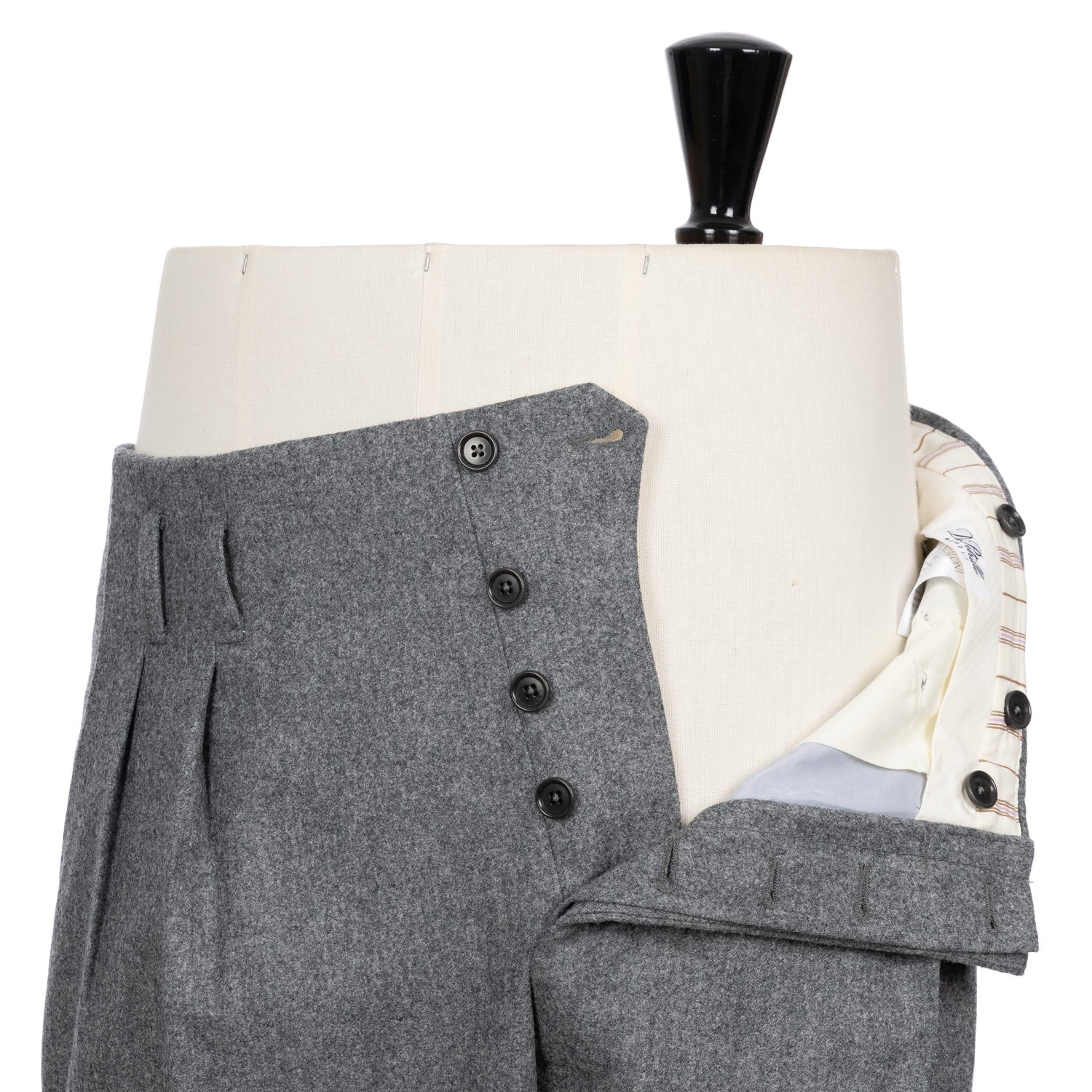 Zwei eingelegte Bundfalten "Inverted Pleats", tiefer sitzende Gürtelschlaufen "Passanti Profondo" und eine sehr hohe Leibhöhe werden von einem weiten Bein mit einer Fußweite von 23cm abgerundet. Ein ganz besonderer Look, der die sartoriale Kultur der 1950er Jahre wiederspiegelt. Die Großen neapolitanischen Stars dieser Zeit, Namen wie Antonio de Curtiz, kurz Totò, Oscar de Sica oder Luchino Visconti, waren großer Freunde dieses Looks und wurden in Roms Filmstadt oft so gesehen.