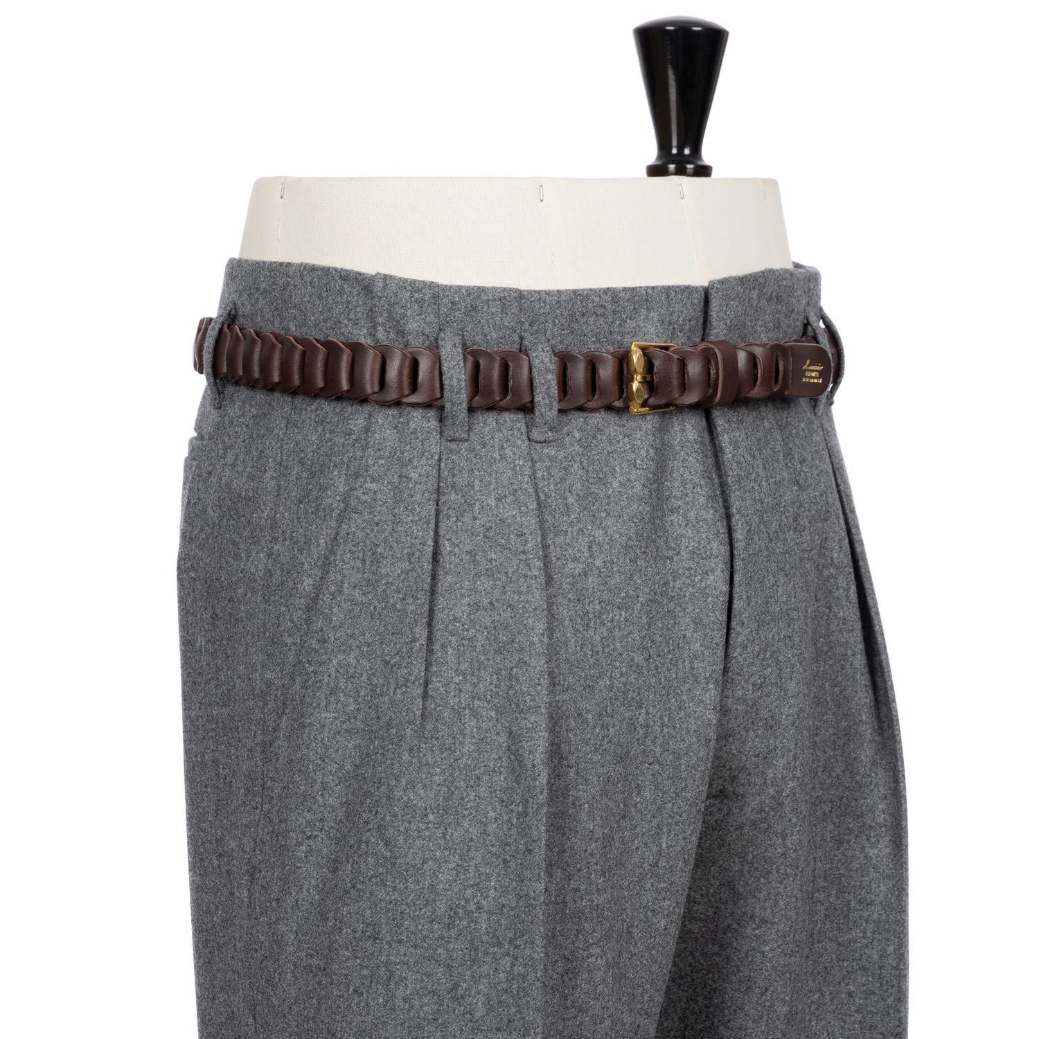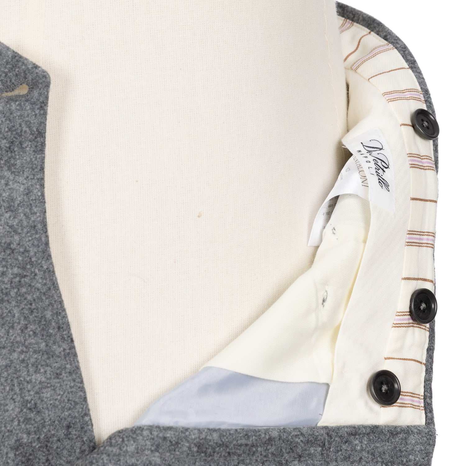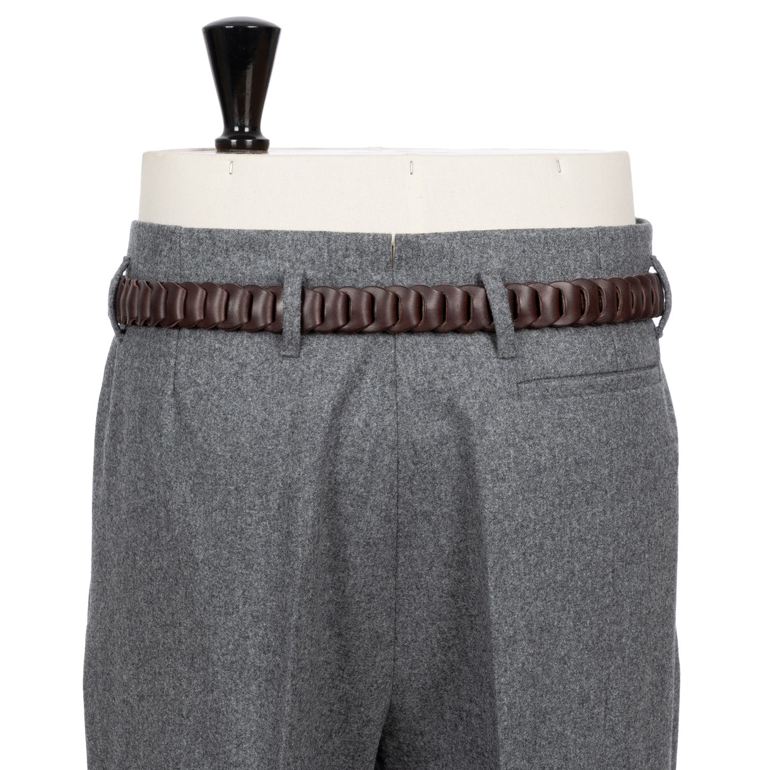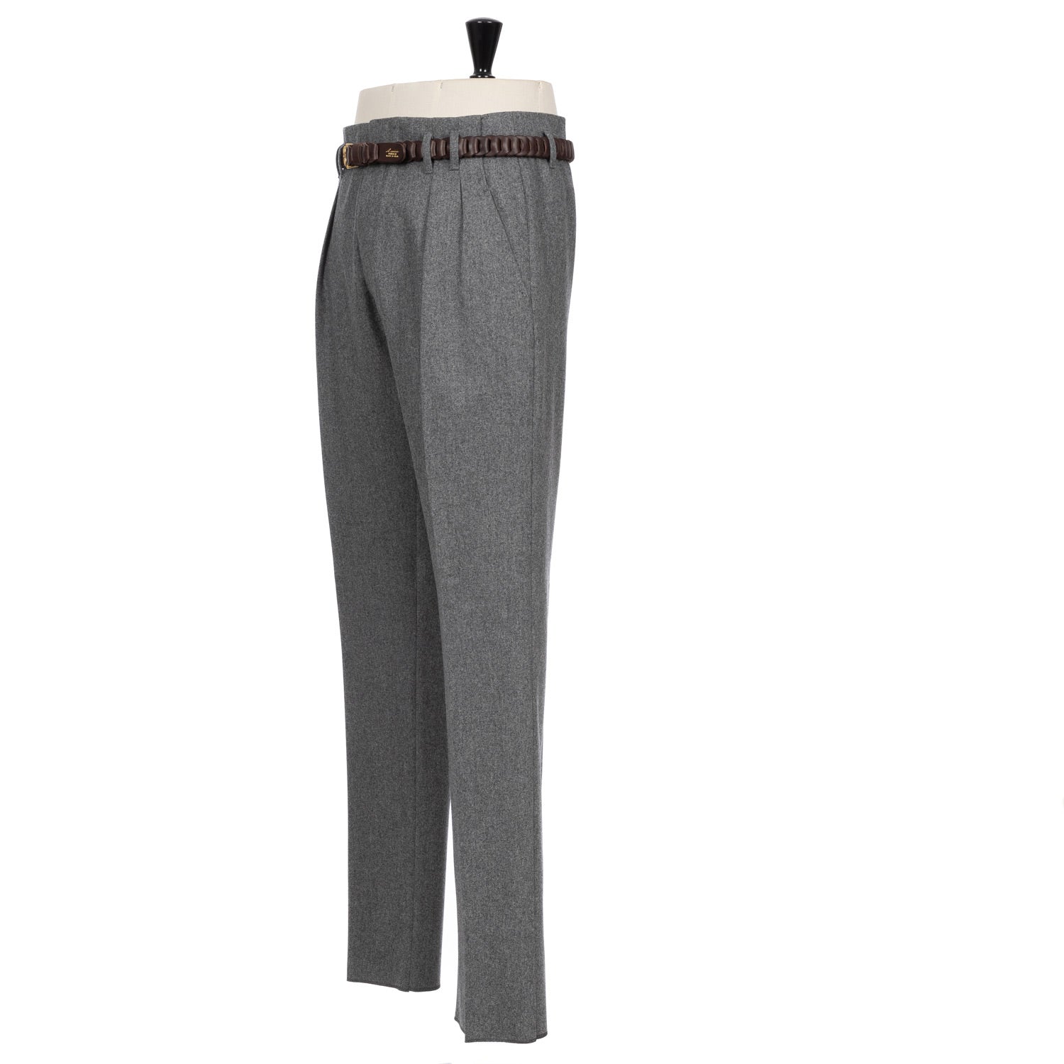 Zwei eingelegte Bundfalten "Inverted Pleats", tiefer sitzende Gürtelschlaufen "Passanti Profondo" und eine sehr hohe Leibhöhe werden von einem weiten Bein mit einer Fußweite von 23cm abgerundet. Ein ganz besonderer Look, der die sartoriale Kultur der 1950er Jahre wiederspiegelt. Die Großen neapolitanischen Stars dieser Zeit, Namen wie Antonio de Curtiz, kurz Totò, Oscar de Sica oder Luchino Visconti, waren großer Freunde dieses Looks und wurden in Roms Filmstadt oft so gesehen.
