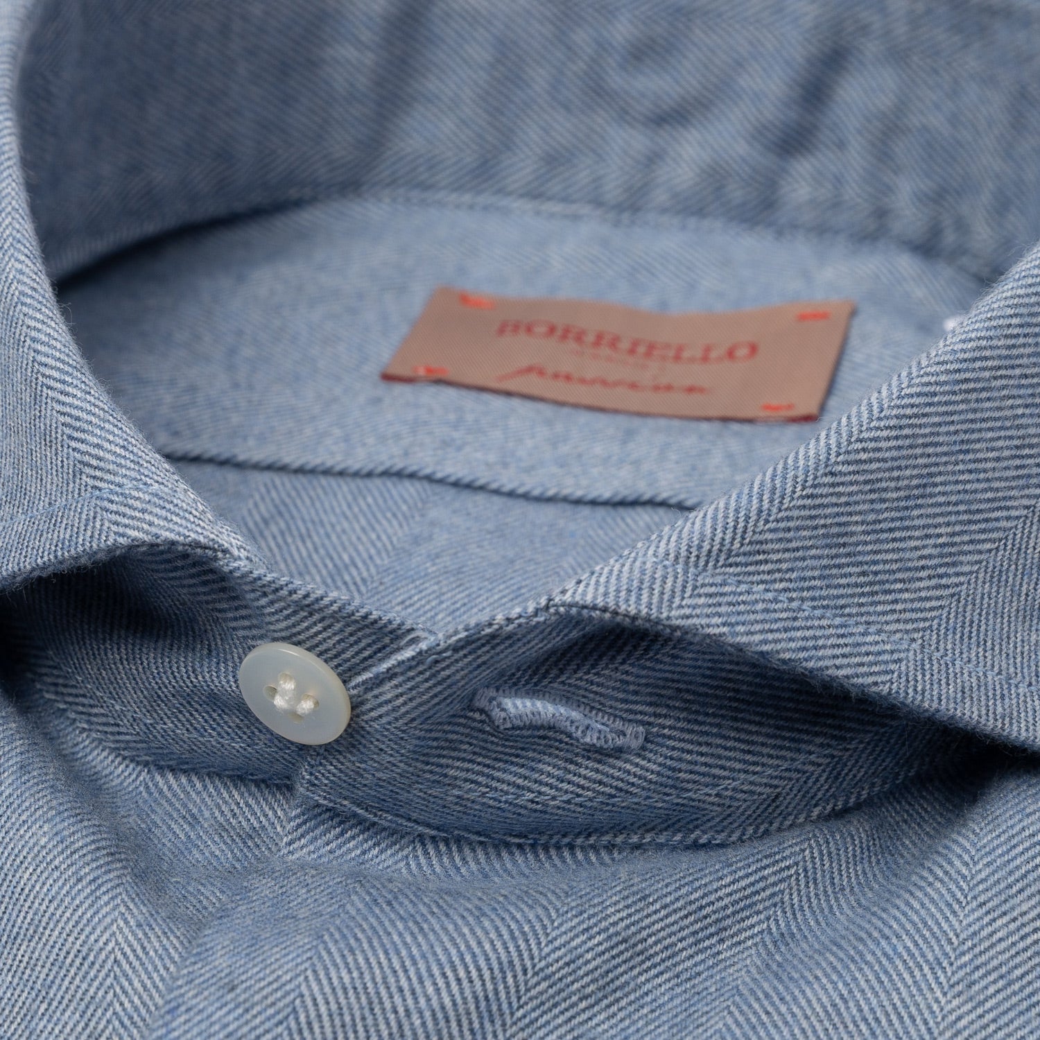 Der weich vorgewaschene und gebürstete Luxury-Flanell, in Verbindung mit dem superweichen Haifischkragen "Marechiaro" und einer Sportmanschette, macht dieses Hemd zu einer besonderen Spezialität aus der Hemdenmanufaktur Borriello - Napoli.