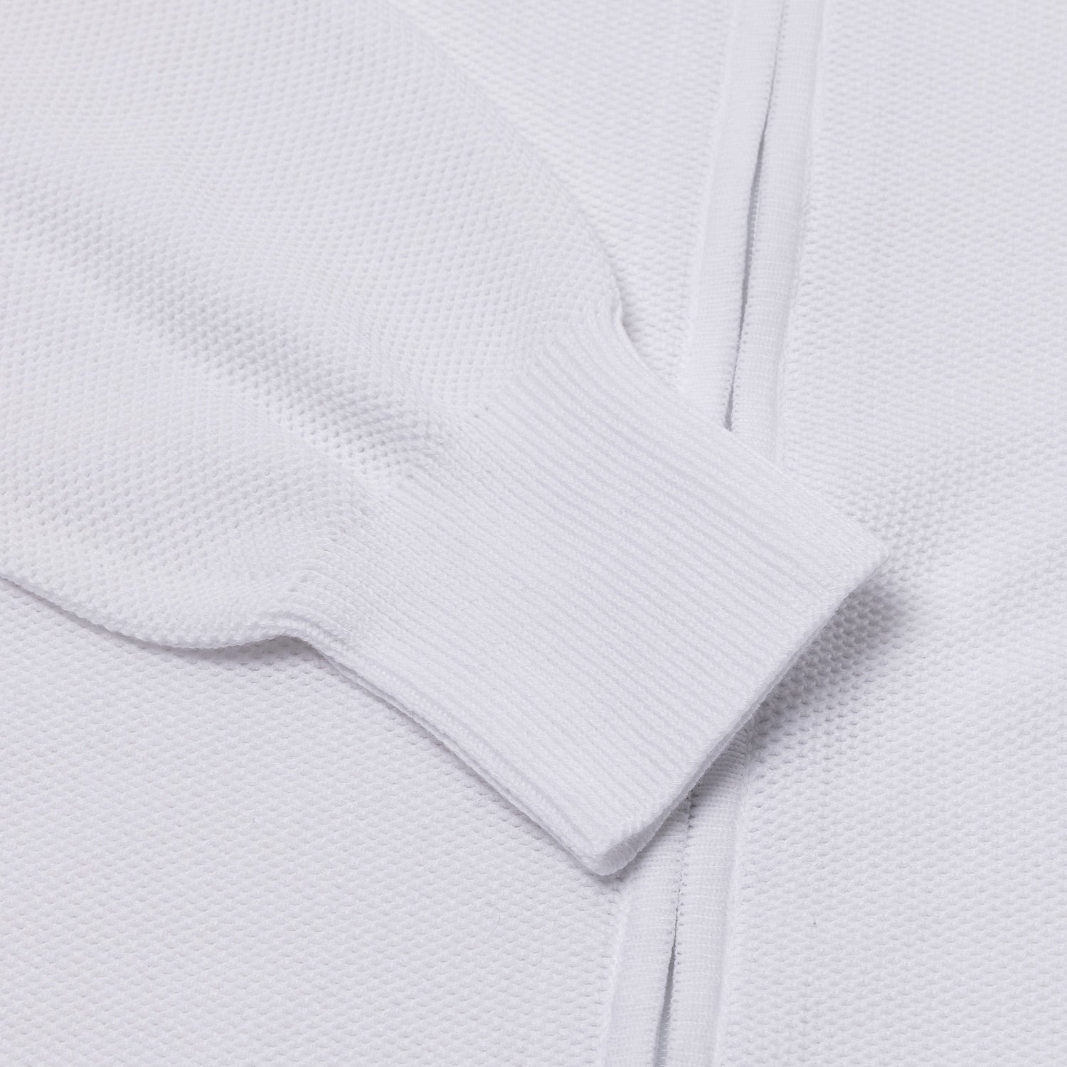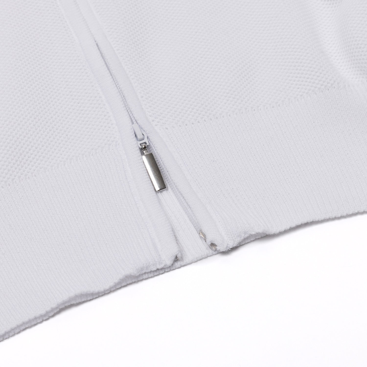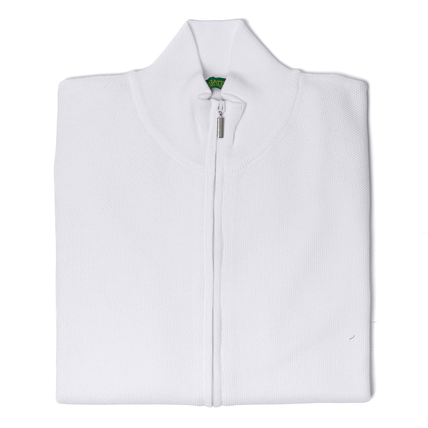 Hier ein Zip-Cardigan in einem strukturierten Warenbild "Honeycomb" , der mit seinen gerippten Bündchen, wie im Besonderen durch den Stehkragen, eine besondere Note bekommt. Natürlich Fully Fashioned verarbeitet.