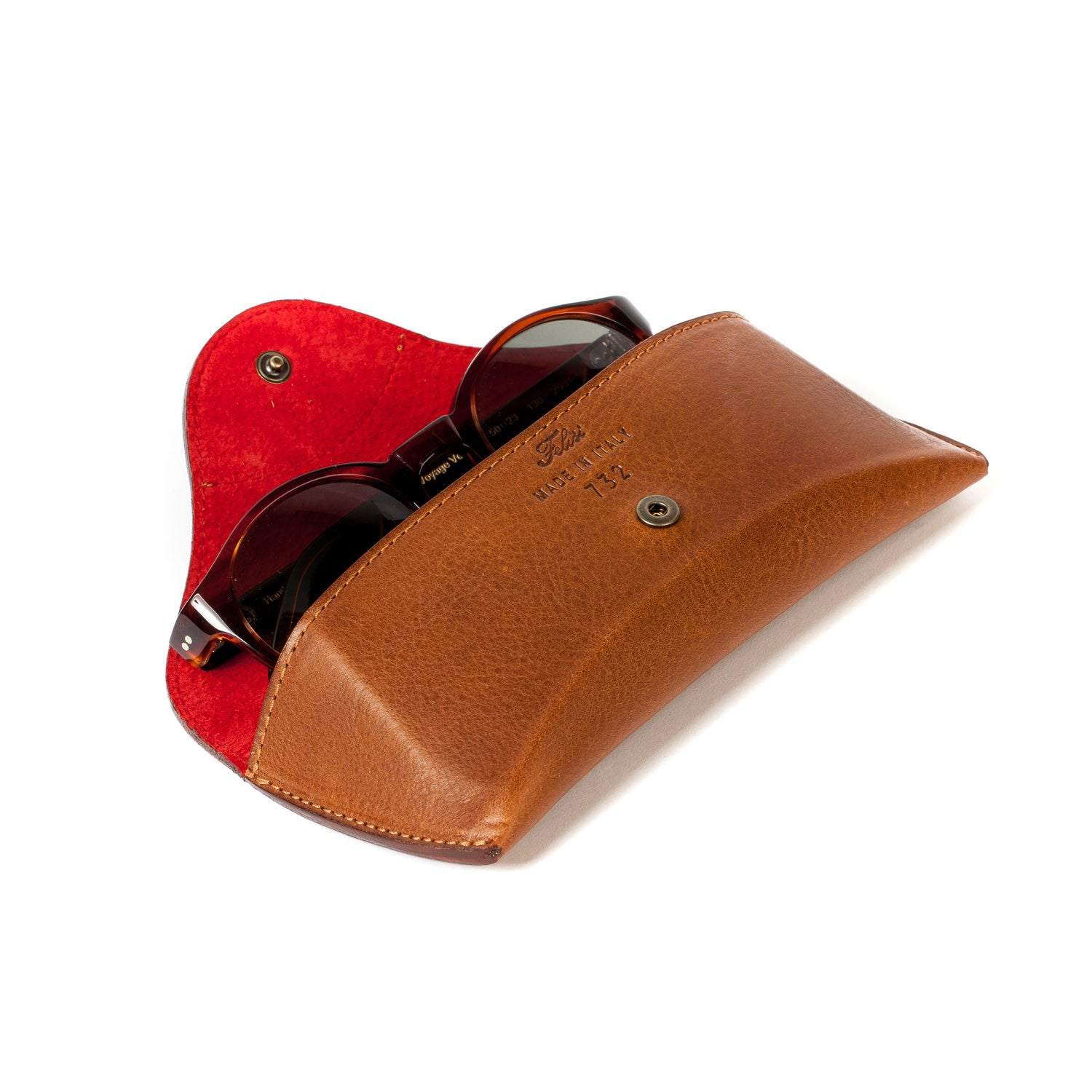Ein Brillenetui aus dem Atelier von Felisi, das durch seine feste Form einen perfekten Schutz für Ihre Brillen bedeutet. Genarbtem Kalbsleder in Mittelbraun und das rote Wildleder als Innenfutter erzeugen einen subtilen Look in traditioneller Form.