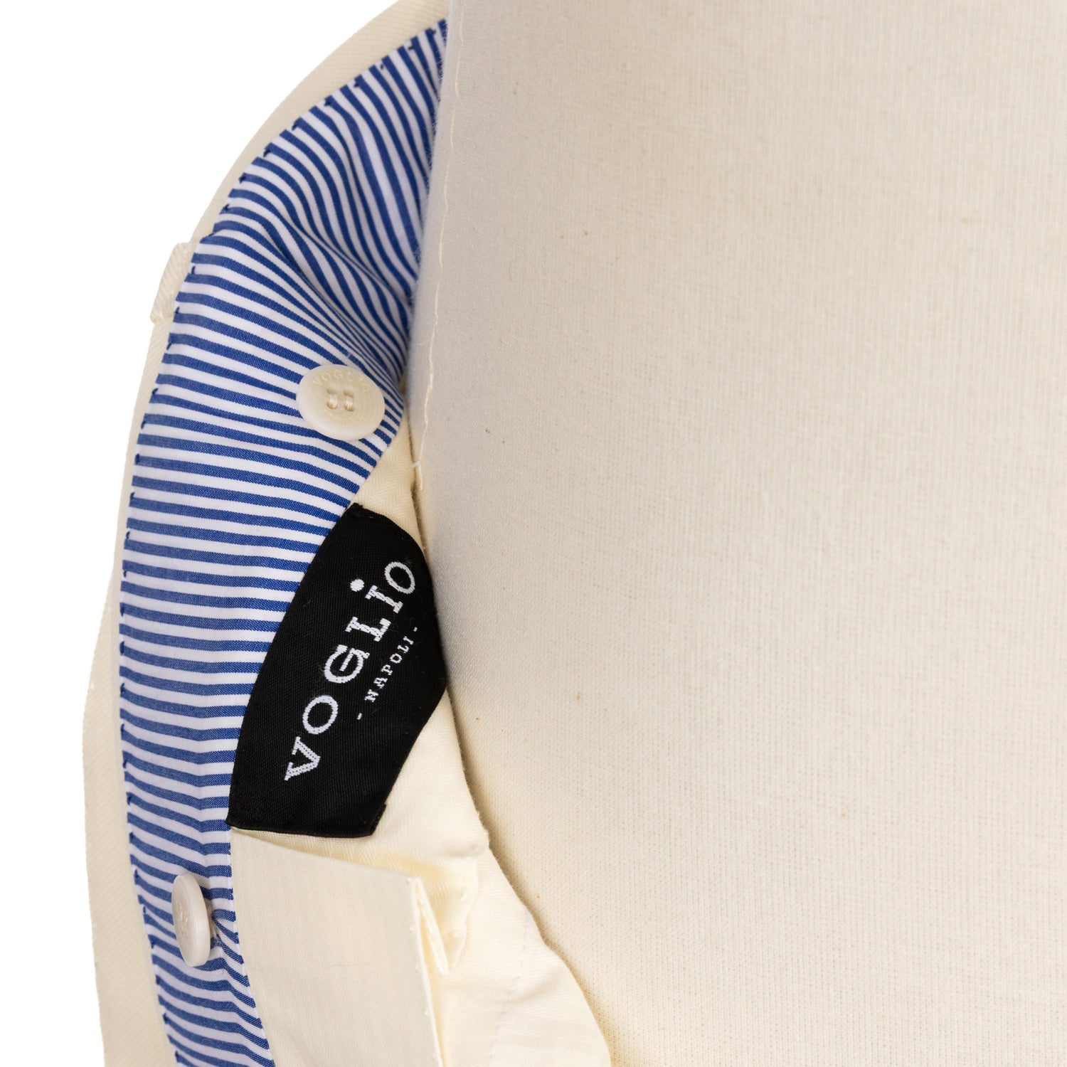 Familie Voglio hat sartoriale Details, wie die "Piega Sartoriale oder den "Cintura Anello Sartoriale", mit einer höheren Leibhöhe und einem etwas weitere Bein vereint. Eine völlig von Hand gefertigte Hose als Inkarnation der neapolitanischen Hosenschneiderei.