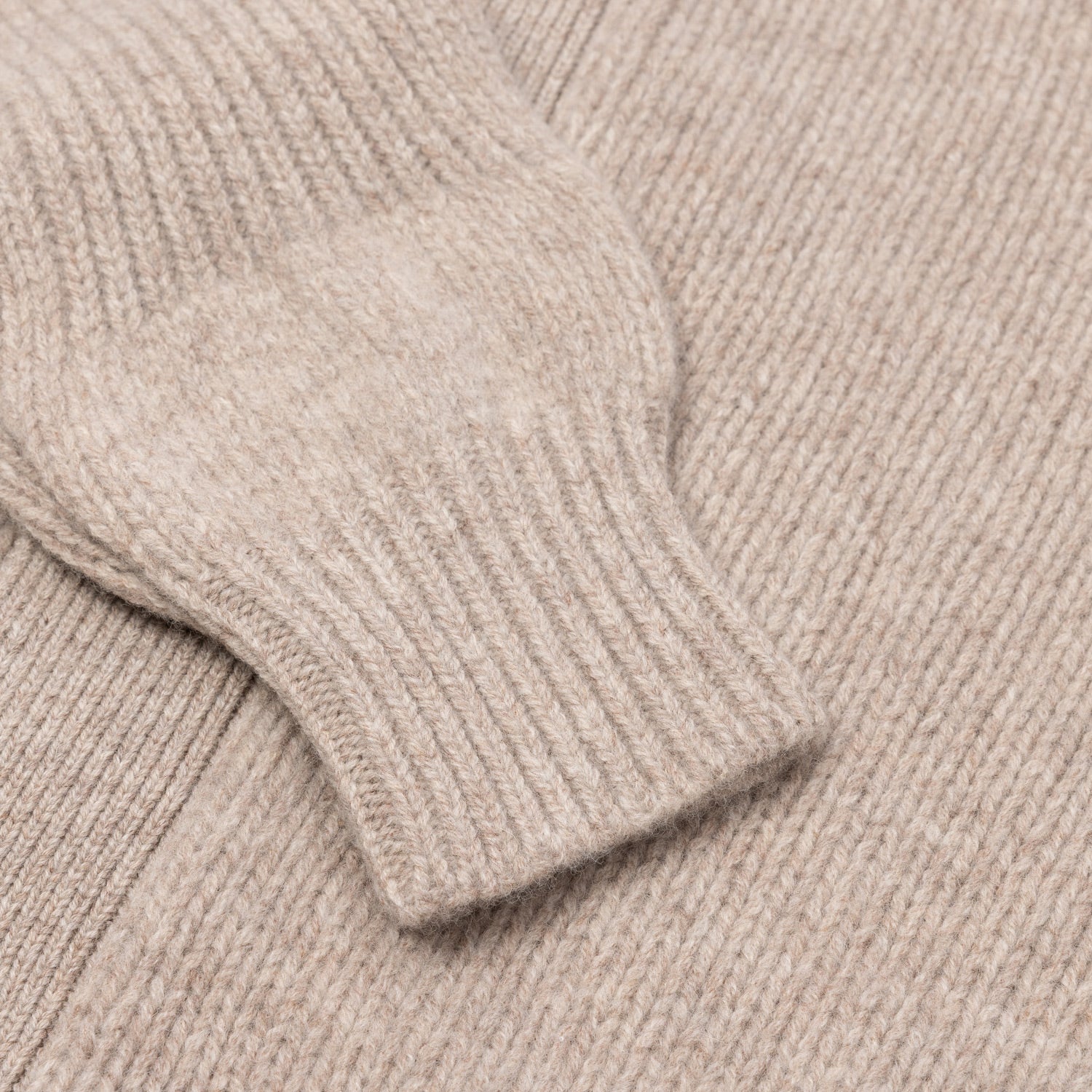 Here is a modern cardigan knitted from the finest lambswool. With its stand-up collar and patch pockets, this cardigan is reminiscent of a bomber jacket. A special feature is the ribbing knitted into the shoulders, back and elbows.