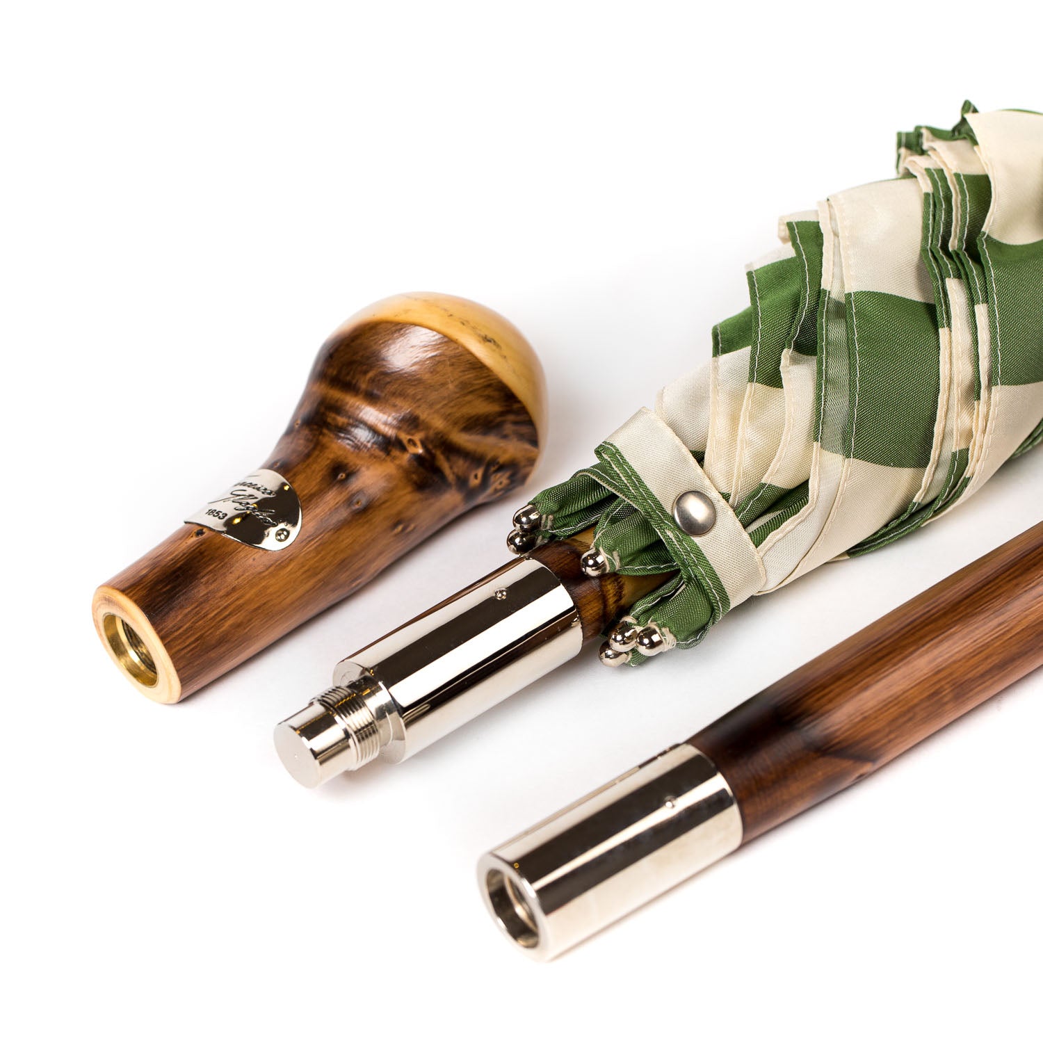 A large umbrella, as a nice sun protection in your garden or on the beach. The screwable handle made of burl wood, which can also be used as a stick, transforms the umbrella into a practical companion for your next picnic or a visit to the beach.