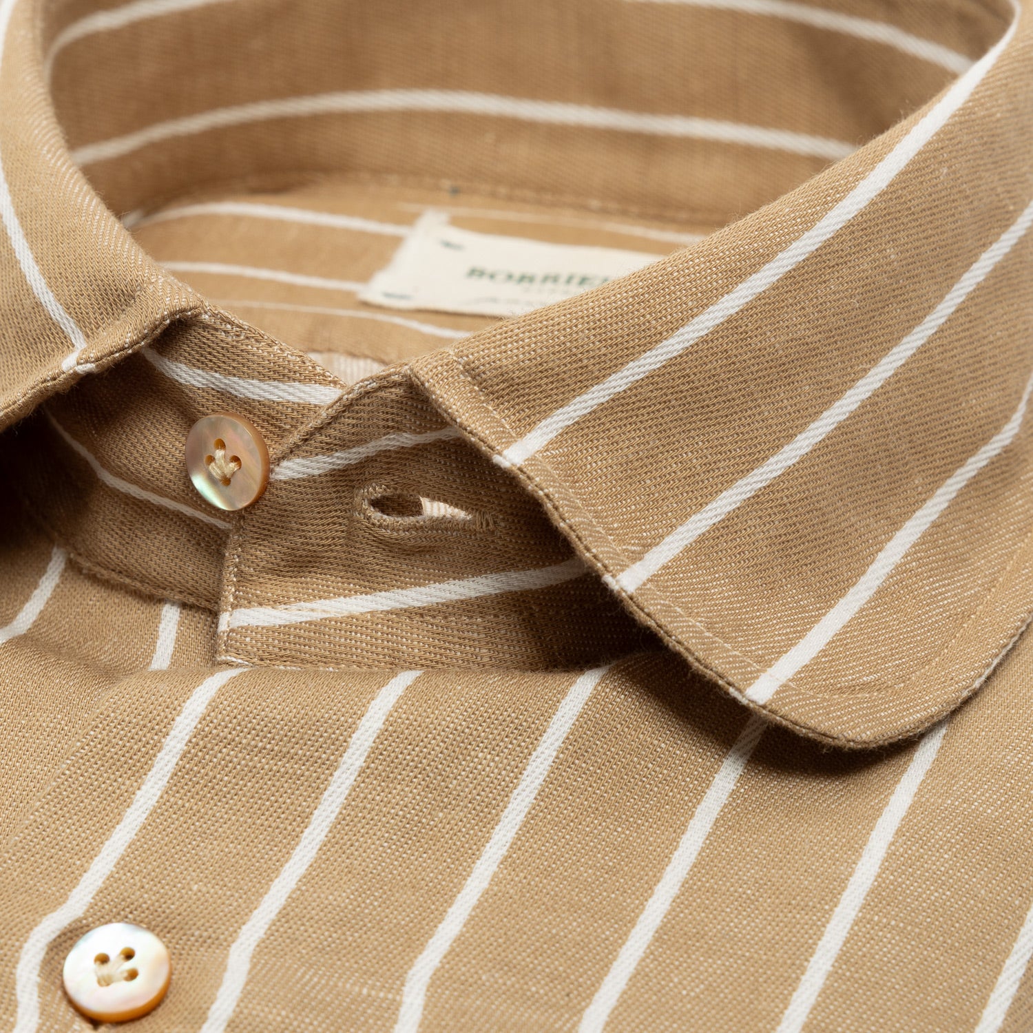 The pre-washed cotton and linen fabric, combined with the super-soft "Malaparte Tondo" collar and a double cuff, makes this shirt a special specialty from the Neapolitan shirt manufacturer Borriello.