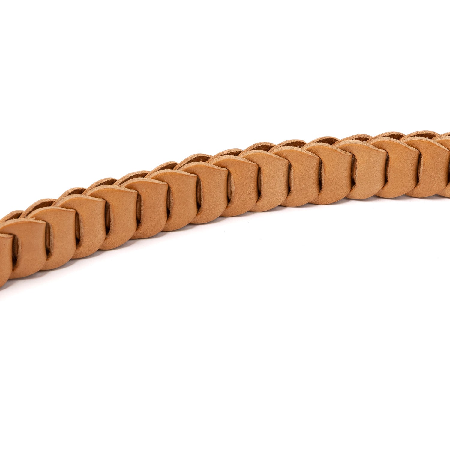 This belt has no holes and is closed by inserting the pin of the buckle through the gap between the individual pieces. This allows for a wide variation of sizes and different style options.