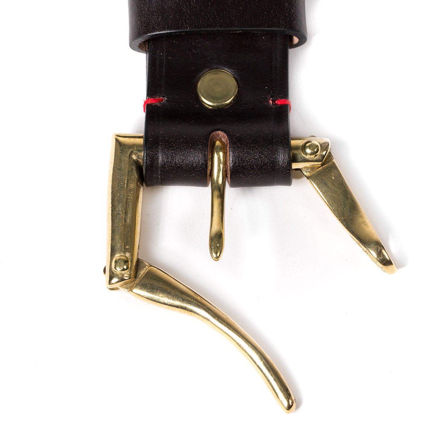 This unique belt uses a massive brass buckle that was originally designed for firefighters to quickly detach their fire hoses. It can be opened with one handle.