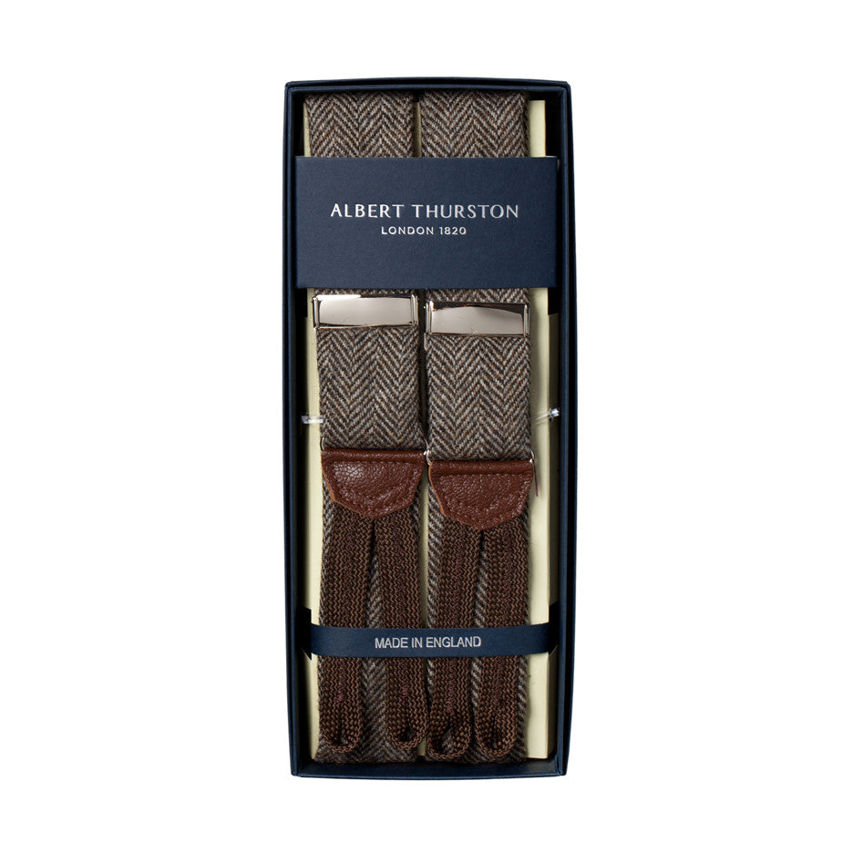 These light brown braces made of wool tweed with silver steel and brown leather details are manufactured in the Albert Thurston manufactory. Made of fine fabrics and magnificent colors, unique pieces are created. The braces are buttoned and can be worn as a modern eye-catcher over the shirt or traditionally with a jacket or suit.