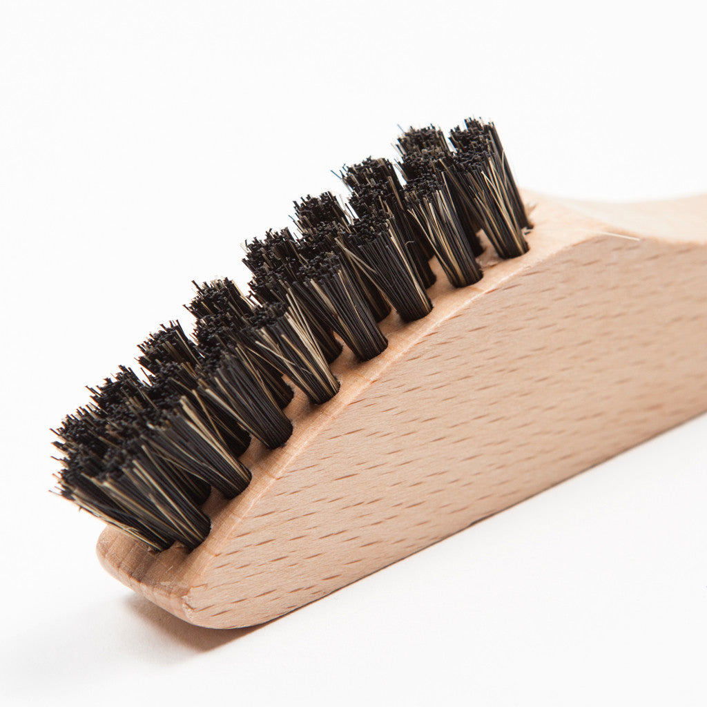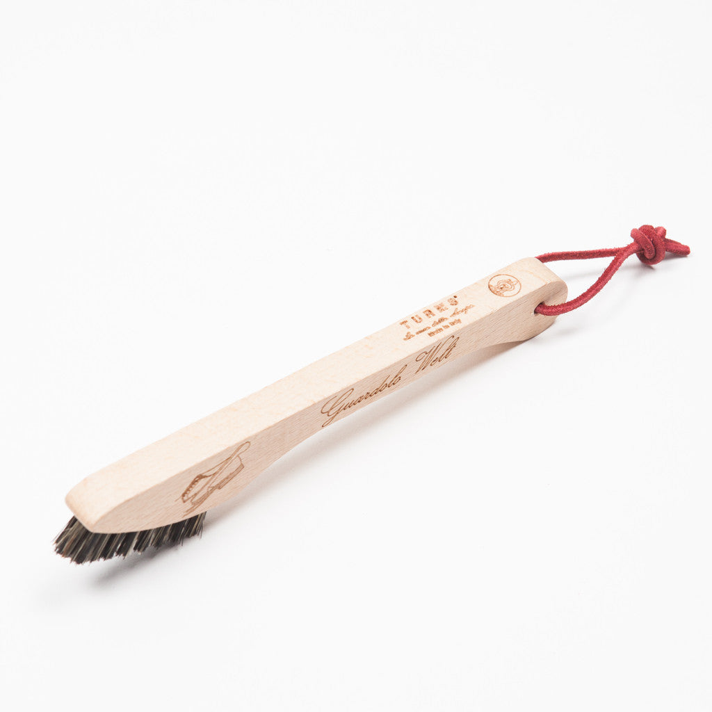 Here is a small brush with hard boar bristles, with which you can clean the edges and welts between upper leather and sole. Particularly suitable for removing stains. Of course, a nice little gift for shoe lovers and cleaning freaks.