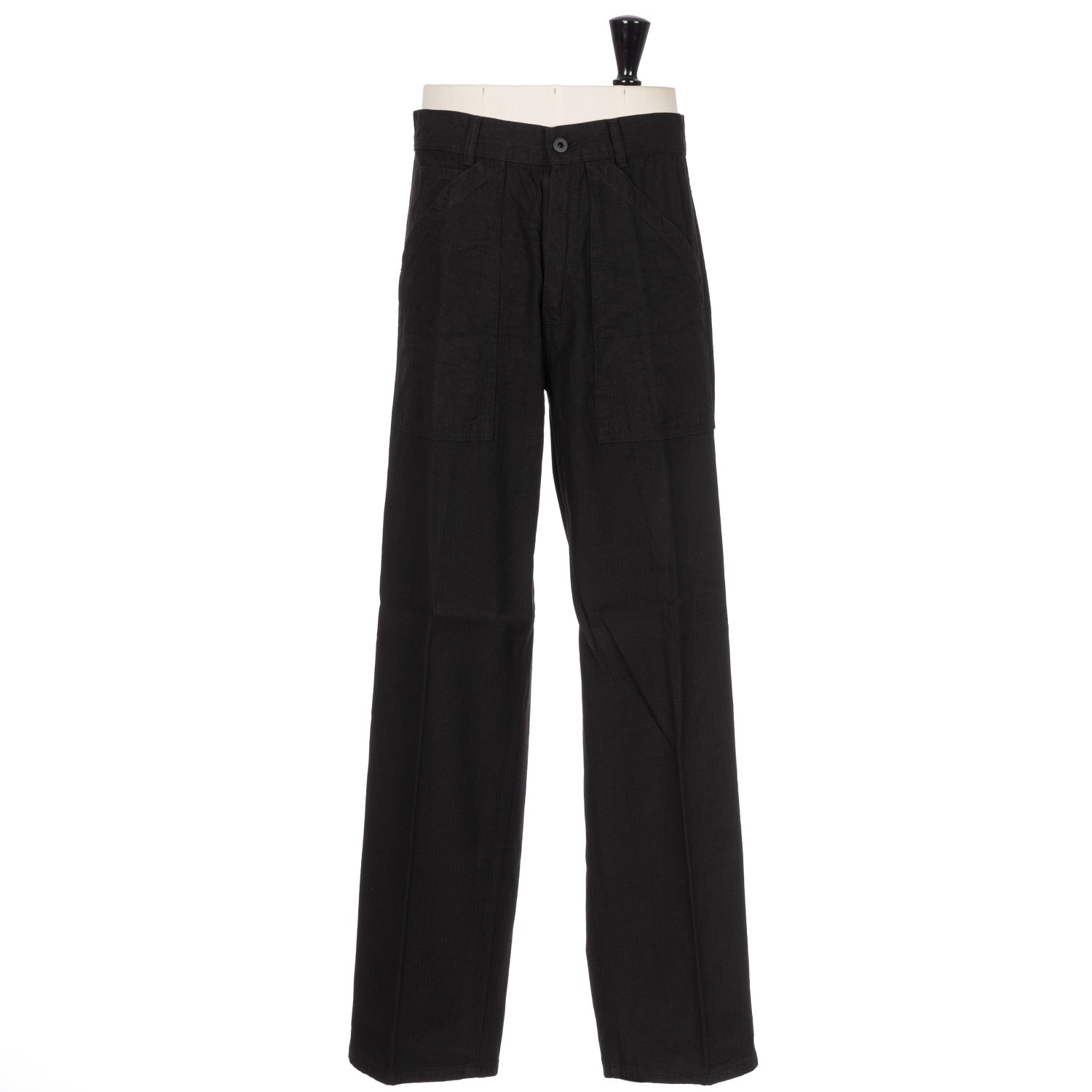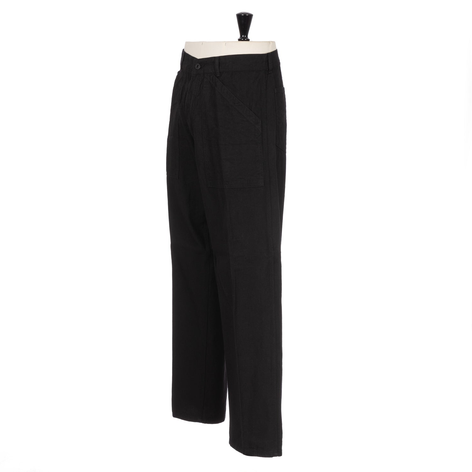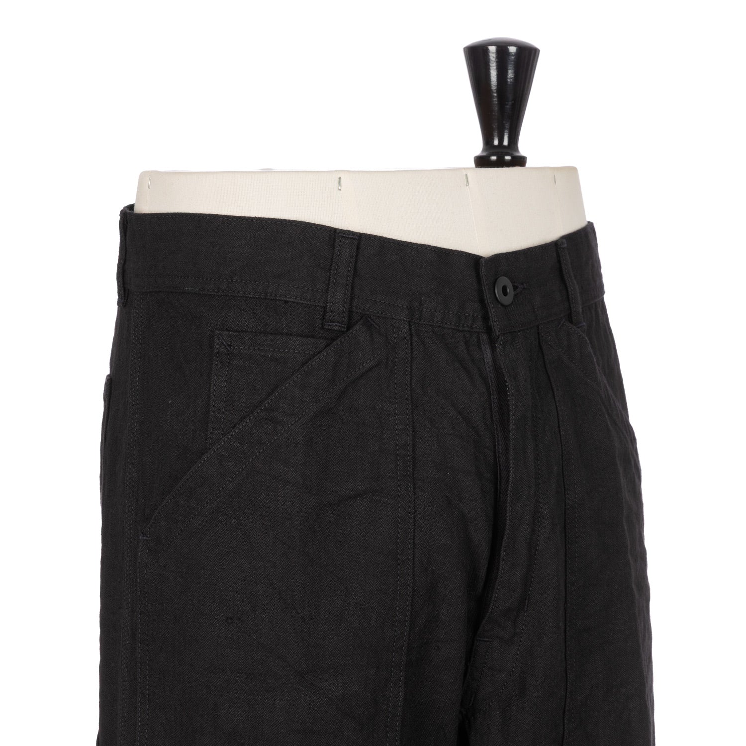 Trousers with universally practical pockets and the typical wide shape of historical workwear.