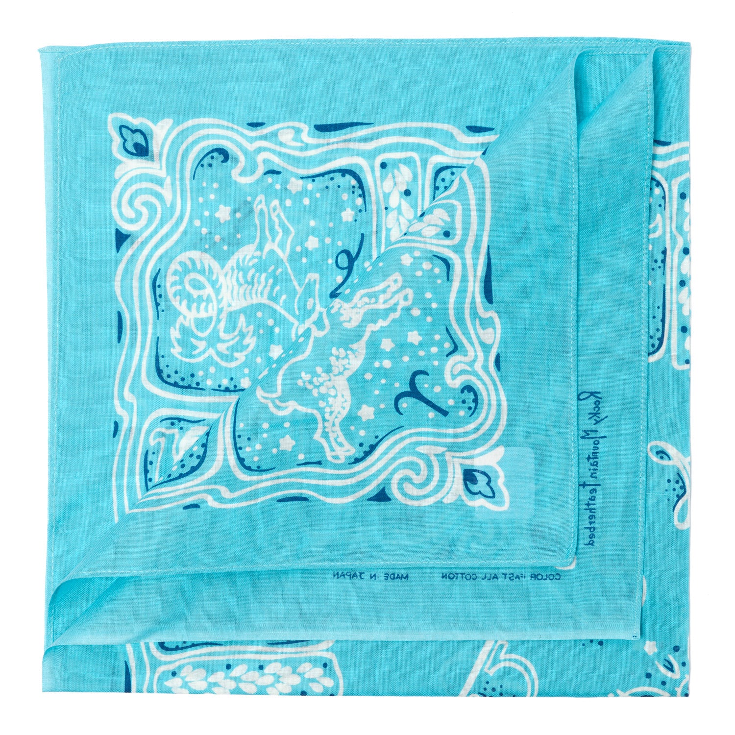 The zodiac bandana from Rocky Mountain Featherbed is made in Japan from 100% cotton and is printed with the motifs of the zodiac signs.