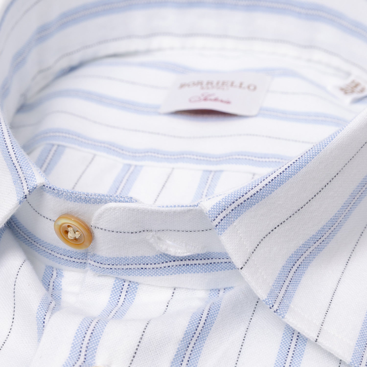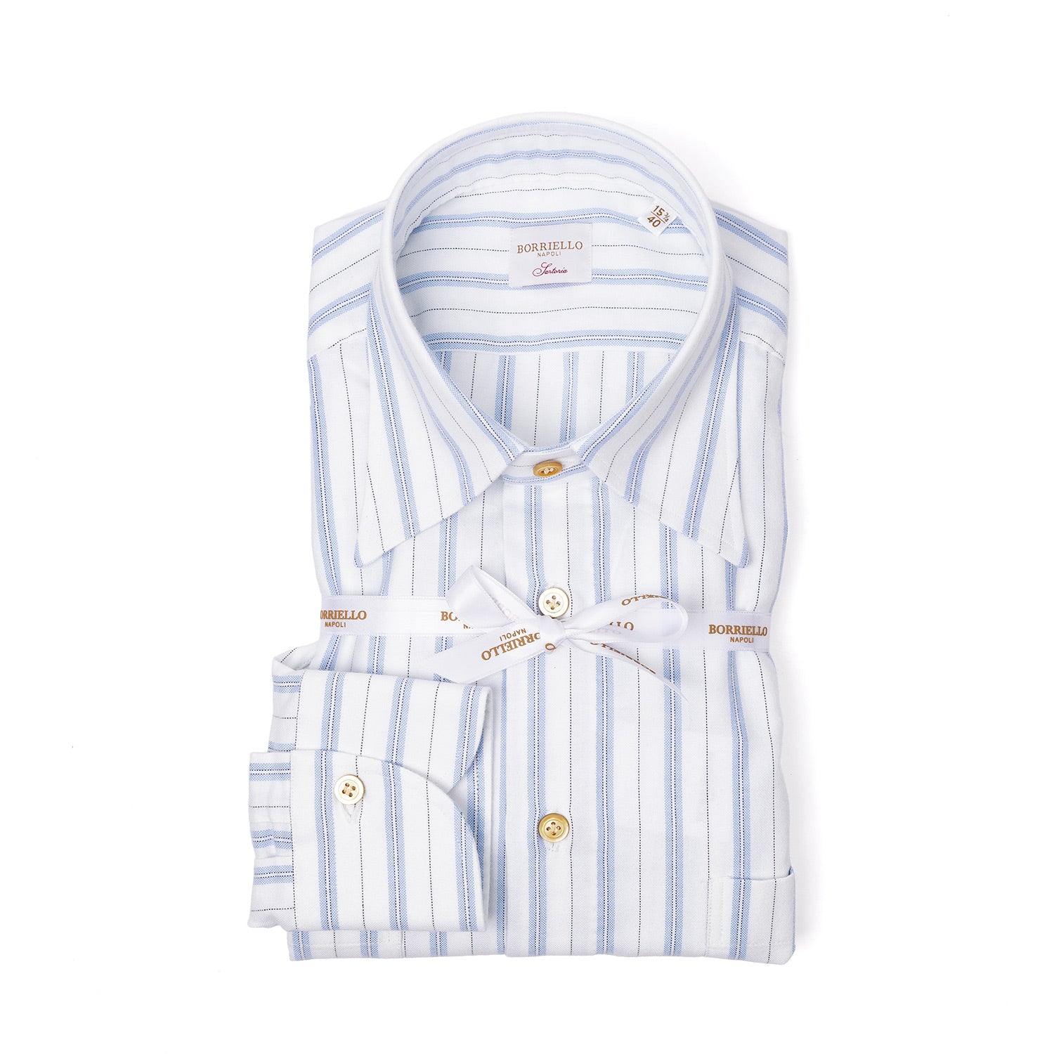A great classic from the shirt manufacturer Borriello - Napoli. The Borriello family has been making shirts in the traditional Neapolitan style since 1977. Collar and shoulders made entirely by hand, as well as Australian mother-of-pearl buttons and buttonholes embroidered with silk thread are just some of the 8 items that are made entirely by hand.