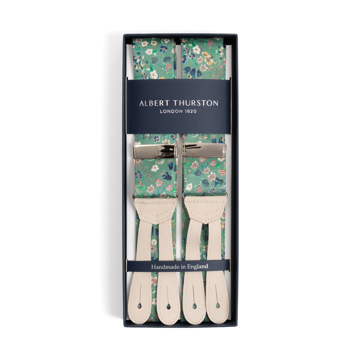 These suspenders with silver steel and brown leather details are made in the Albert Thurston factory. Unique creations are made from fine fabrics and great colors.