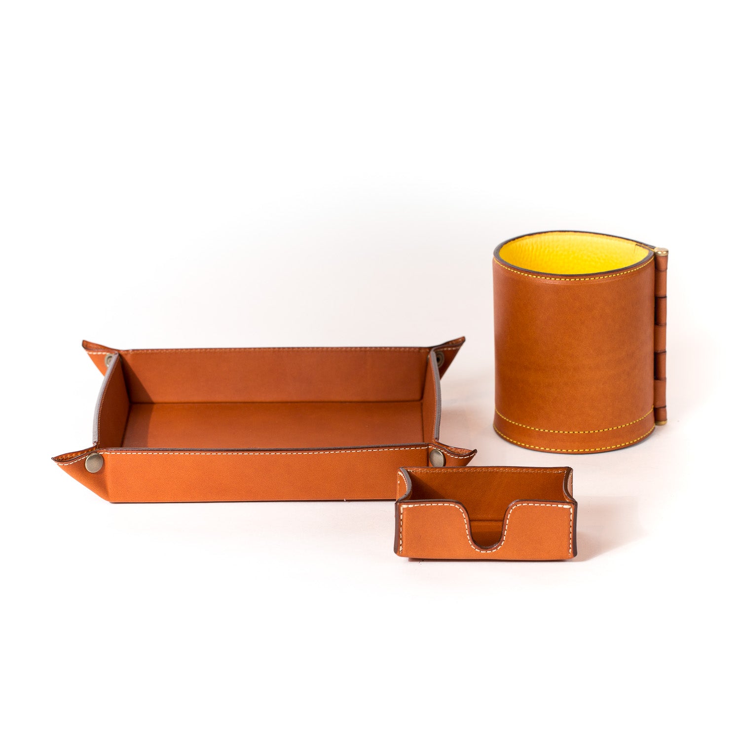 A rectangular leather bowl for storing small items such as paper clips, stamps and other office supplies. This brings order to the desk and makes the home office even more fun!