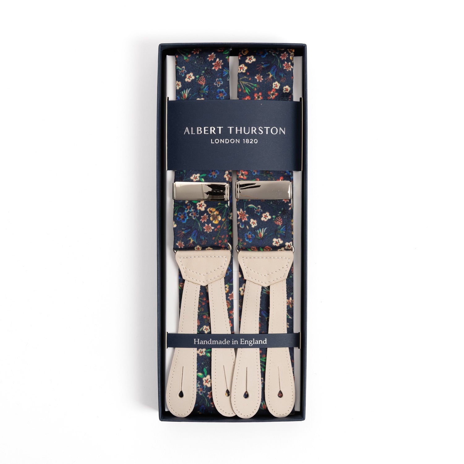 These suspenders with silver steel and brown leather details are made in the Albert Thurston factory. Unique creations are made from fine fabrics and great colors.