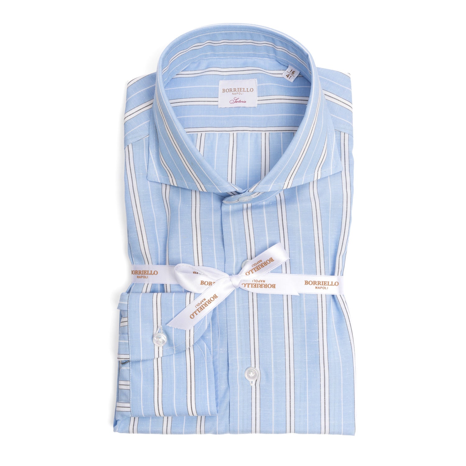A great classic from the Borriello - Napoli shirt manufactory. The Borriello family has been making shirts in the traditional Neapolitan style since 1977. Collar and shoulder in pure handwork, as well as Australian mother-of-pearl buttons and buttonholes embroidered with silk thread are only a part of 8 points that are processed in pure handwork.