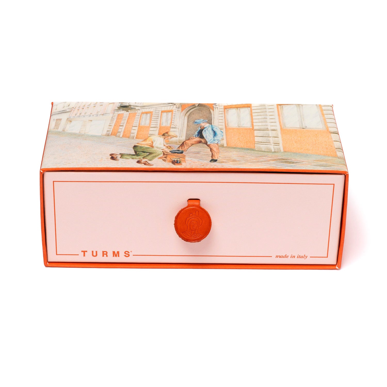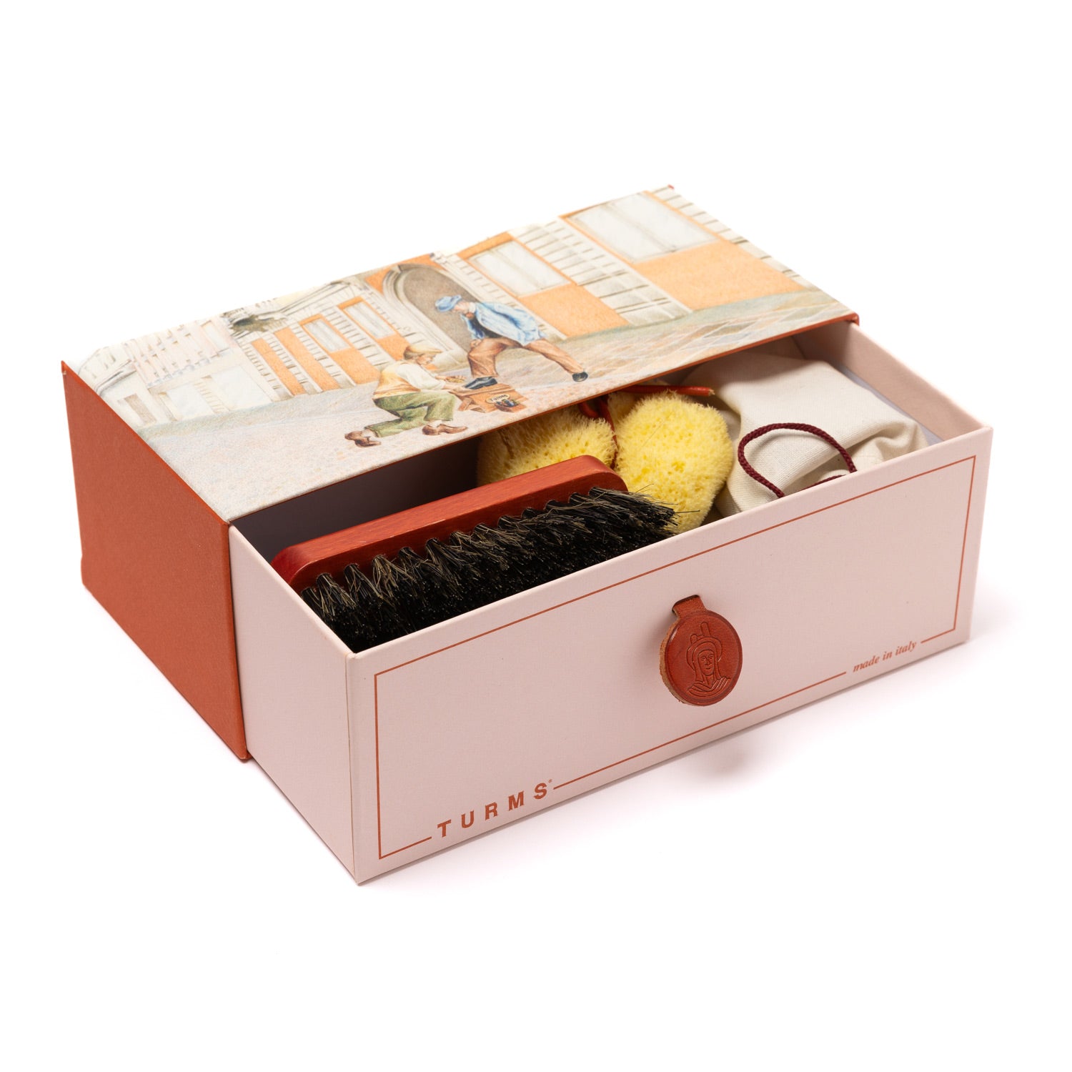 Hier ein Putzset zur Pflege Ihrer Schuhe aus Rauhleder. Die dekorative Schubladen-Box, mit dem für Turms typischen Motiv des Schuhputzers, beinhaltet alles, was man für die Pflege von Schuhen aus Kalbs- oder Rossleder benötigt.