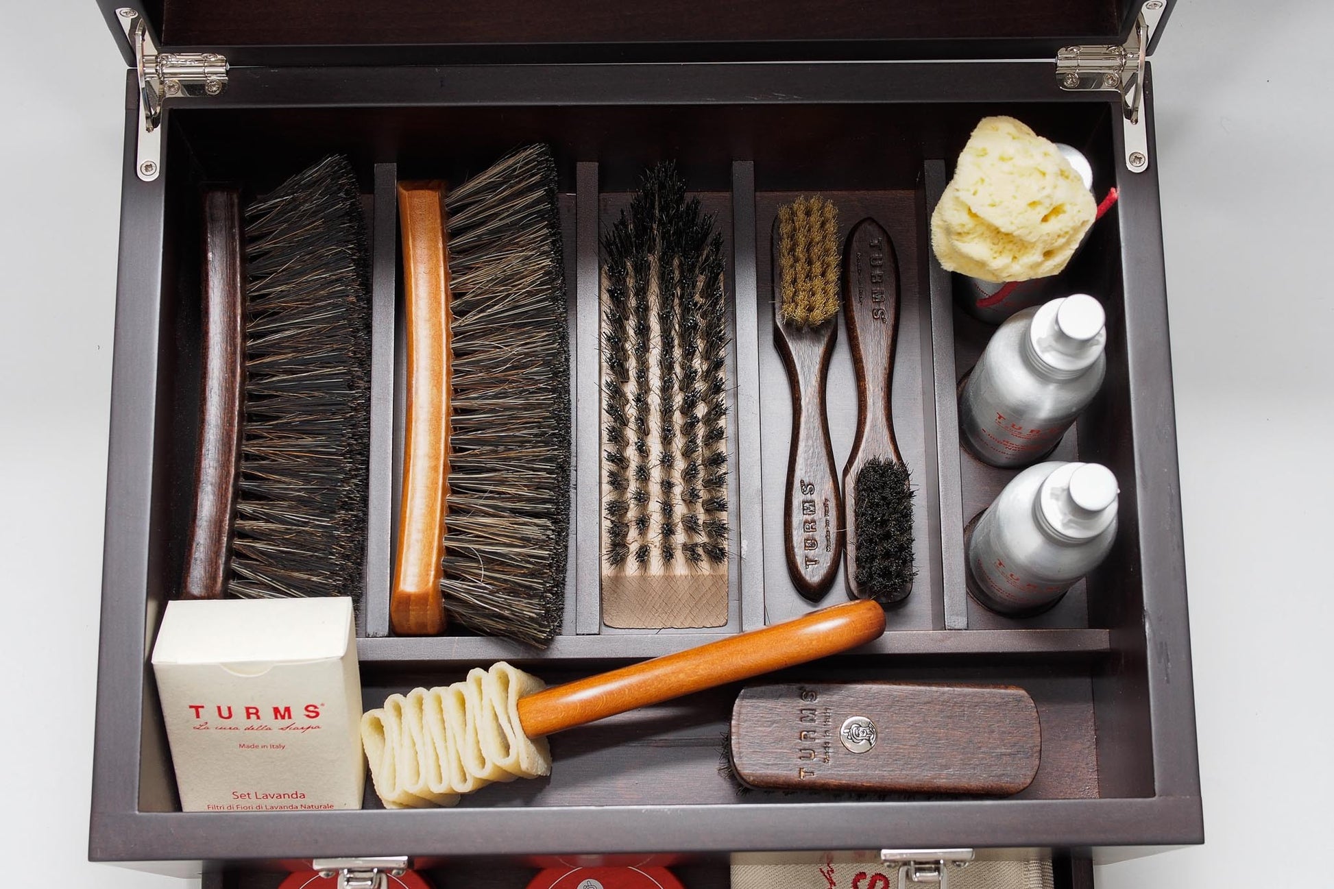 - Inhalt: 2 Rosshaarbürsten, Schmutzbürste, 3 Cremebürsten, 1 Duftset "Lavendel", Putztuch, 1 Wildlederbürste "Rubber", 1 Wildlederbürste mit Wildschweinborsten, Schuhlöffel "Viaggio", 2 kleine Bürsten, grosse Rosshaarbürste, Duftset "Lavendel", 2 Sprays "Deodorant" + "Waterproof", 1 Schuhshampoo, 4 Schuhcremes, Polierhandschuh, Schuhlöffel