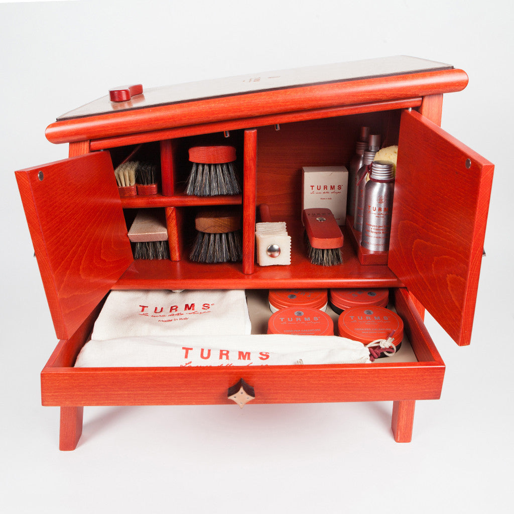 Hier eine Schuhpflegeset in Form eines Kleinmöbels. So haben Sie eine komplette Ausstattung der Schuhpflege immer an einem Ort und Sie können Ihrem Hobby, der Schuhplege, perfekt nachgehen.