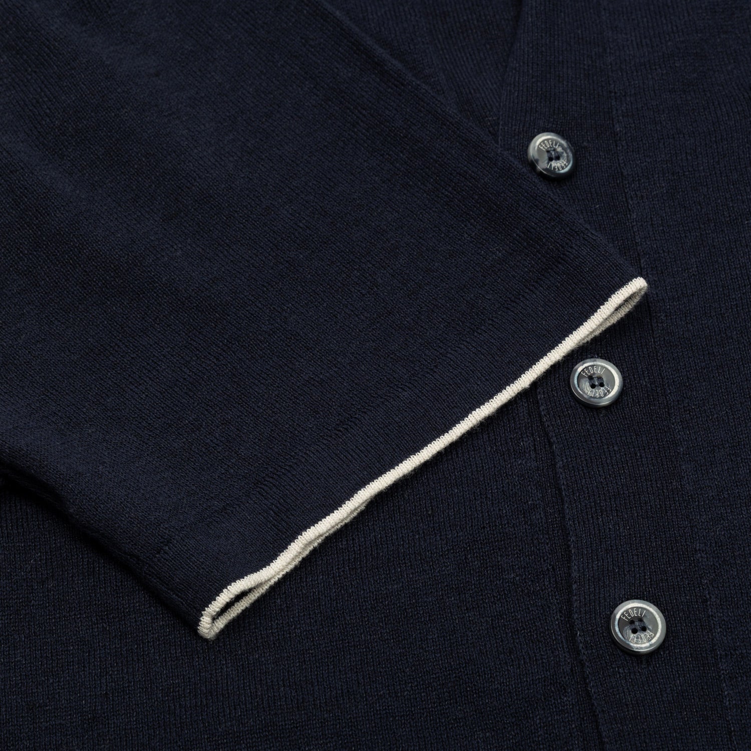 Der Polokragen mit Kontrastrand, die durchgeknöpfter Knopfleiste und das feine Warenbild unterstreichen die modern elegante Note von diesem wunderbaren Strickpolo.